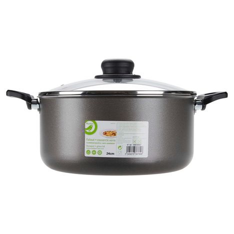 Faitout aluminium avec couvercle en verre 22 cm, couleur noir. Compatible tous feux dont induction, avec revêtement antiadhésif en aluminium. Poignée fixe pour une manipulation aisée.