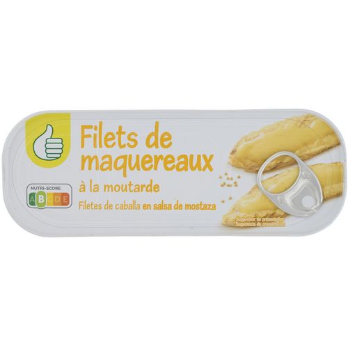 Ingrédients : Filets de maquereaux (POISSONS)56% (Scomber scombrus), eau, MOUTARDE de Dijon (eau, graines de MOUTARDE, vinaigred’alcool, sel) 10%, huile de tournesol, vinaigre d’alcool, vinaigre de vinblanc, amidon modifié de maïs, sel, épaississants : gomme xanthane et gommeguar, extrait de curcuma.