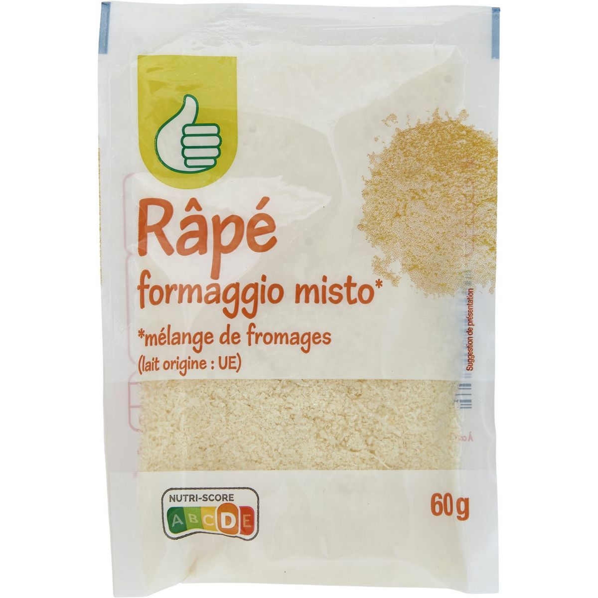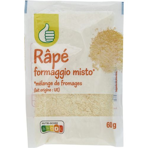 Ingrédients : Fromage à pâte dure (60%) (LAIT de vache thermisé - température inférieure à la pasteurisation [origine : UE], sel, coagulant microbien), fromage Parmigiano Reggiano AOP (20%) (LAIT cru de vache, sel, présure), fromage Grana Padano AOP (20%) (LAIT cru de vache, sel, présure, conservateur : lysozyme d’ŒUF).