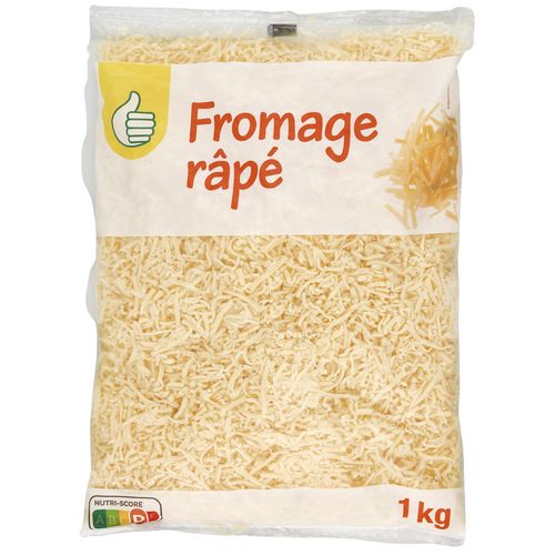 Ingrédients : Fromage à pâte pressée non cuite 66% minimum : LAIT de vache pasteurisé, sel, ferments lactiques (LAIT), coagulant microbien. Emmental (fromage à pâte pressée cuite) 32% minimum : LAIT de vache pasteurisé, sel, ferments lactiques (LAIT), coagulant microbien. Antimottant : fécule de pomme de terre 2% maximum. Élaboré à partir de lait origine UE