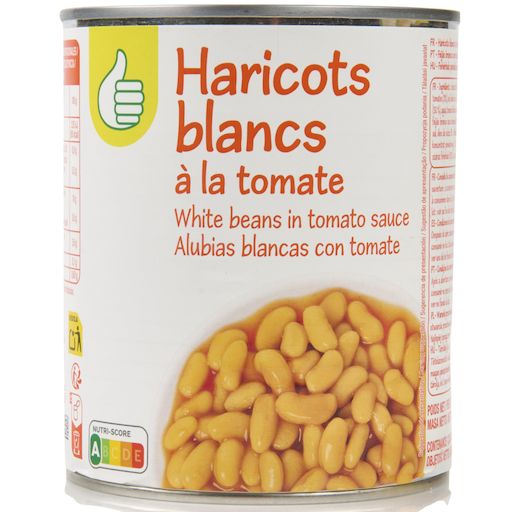 Ingrédients : Eau, haricots blancs, purée de tomates double concentrée (1,9%),sel, amidon modifié, arôme naturel.Peut contenir des traces de céréales contenant du gluten et de soja.