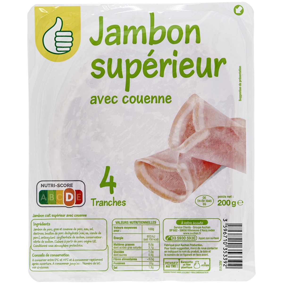 Ingrédients : Jambon de porc, gras et couenne de porc, eau, sel, dextrose, bouillon de porc déshydraté (eau, os, viande de porc), antioxydant: érythorbate de sodium, conservateur: nitrite de sodium. Elaboré à partir de porc origine U.E.