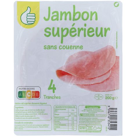 Ingrédients : Jambon de porc, eau, sel, dextrose, bouillon de porc déshydraté (eau, os, viande de porc), antioxydant: érythorbate de sodium, conservateur: nitrite de sodium. Elaboré à partir de porc origine U.E.