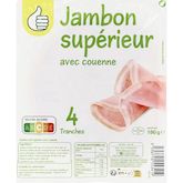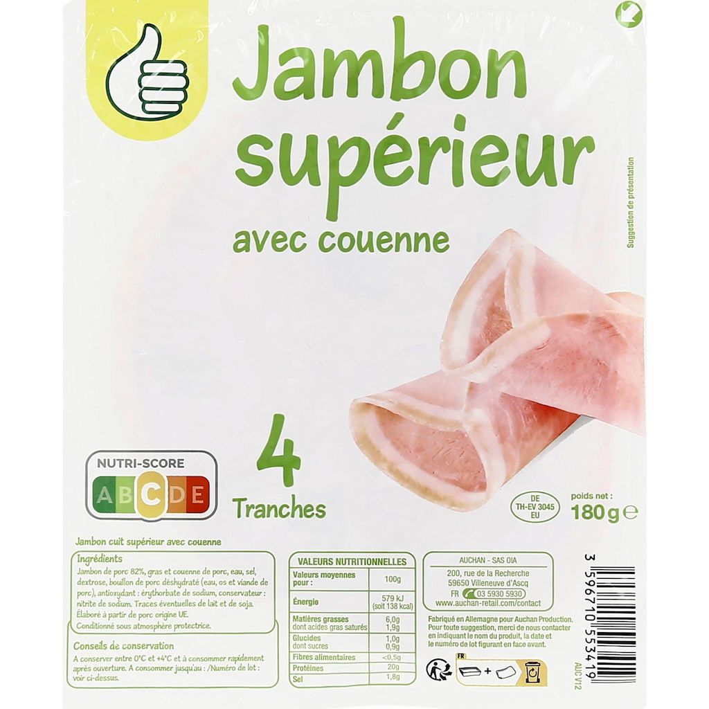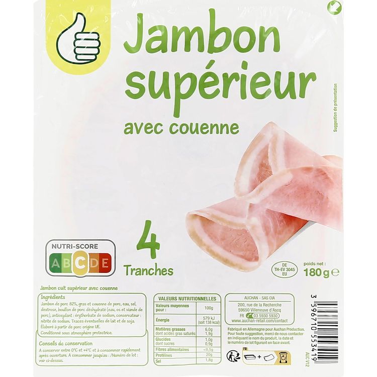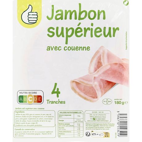 Ingrédients : Jambon de porc 82%, gras et couenne de porc, eau, sel, dextrose, bouillon de porc déshydraté (eau, os et viande de porc), antioxydant: érythorbate de sodium, conservateur: nitrite de sodium. Traces éventuelles de lait et de soja. Elaboré à partir de porc origine UE.