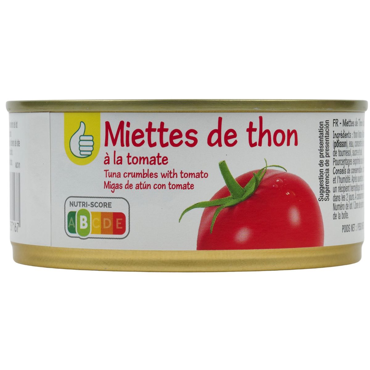 Ingrédients : Thon listao ( Katsuwonus pelamis ) (POISSON), eau, concentré de tomate 9%, huile de tournesol, sucre et sel. Pourcentages exprimés sur le total de la recette.