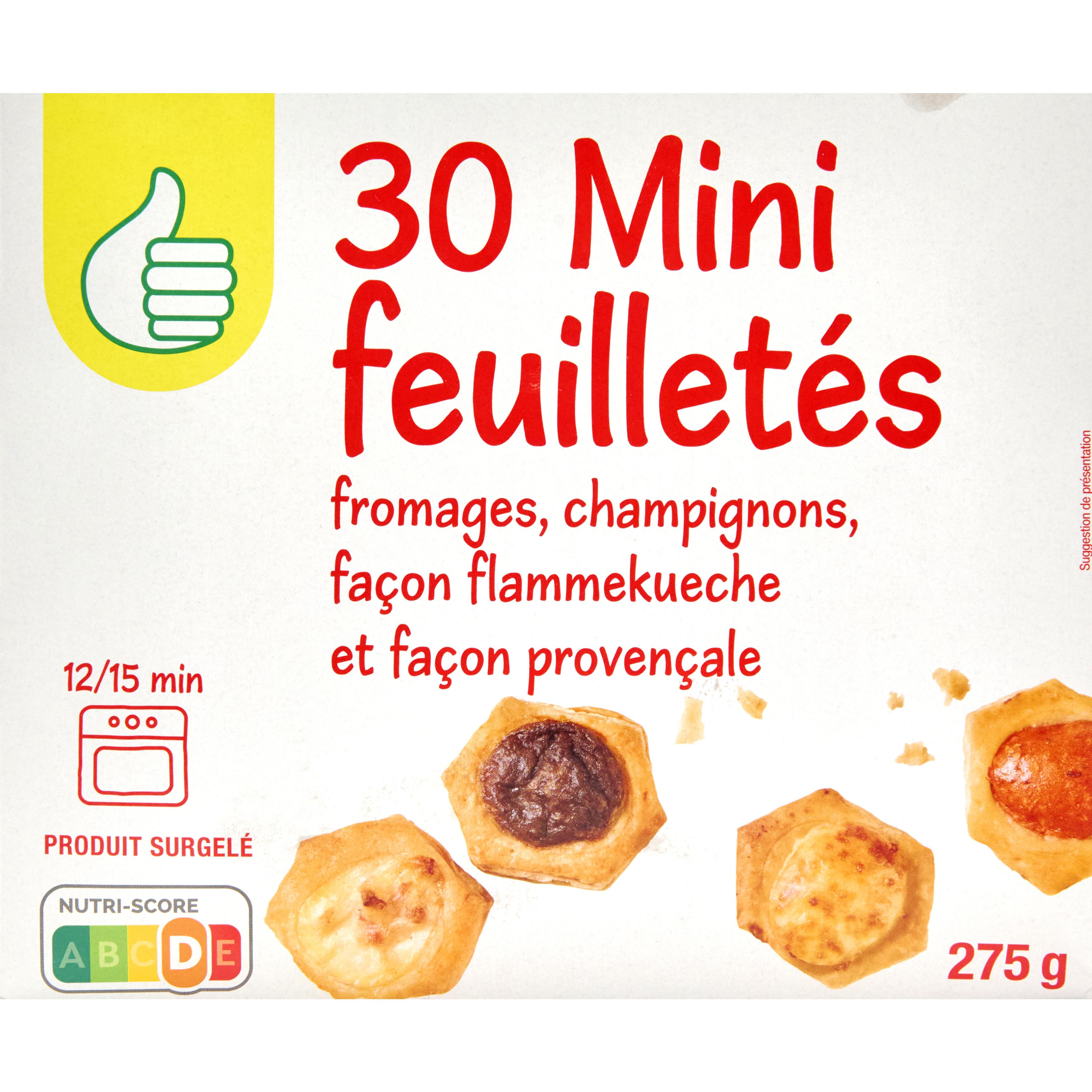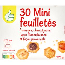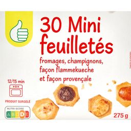 Ingrédients : Mini-feuilletés garniture à base de champignon : farine de BLÉ,eau, margarine (graisse de palme, eau, huile de colza, sel, émulsifiants :mono- et diglycérides d'acides gras, correcteur d'acidité : acide citrique), champignon de Paris 17,3%*, crème (LAIT), échalote, amidon, sel, huile d'olive vierge extra, ŒUF entier en poudre, épaississant : méthylcellulose stabilisant : carraghénanes. Mini-feuilletés garniture à base de fromages : eau, farine de BLÉ, margarine (graisse de palme, eau,huile de colza, sel, émulsifiants : mono- et diglycérides d'acides gras,correcteur d'acidité : acide citrique), emmental râpé 9,2%* (LAIT), lactosérum en poudre (LAIT), amidon, sel, fromages fondus en poudre (fromage 0,6%* (LAIT), sels de fonte : citrates de sodium, sel), ŒUF, ŒUF entier en poudre, LAIT entier en poudre, méthylcellulose. Mini-feuilleté garniture à base de lardon cuit fumé, d'oignon et de crème fraîche : eau, farine de BLÉ, margarine (graisse de palme, eau, huile de colza,sel, émulsifiants : mono- et diglycérides d'acides gras, correcteur d'acidité :acide citrique), lardon cuit fumé 8,3%* (poitrine de porc (origine France), sel, acidifiant :acide citrique, dextrose, antioxydant : érythorbate de sodium, conservateur :nitrite de sodium), oignon 4,4%*, crème fraîche 3,3%* (LAIT), lactosérum en poudre (LAIT), amidon, sel, OEUF en poudre, méthylcellulose, LAIT entier en poudre. Mini-feuilletés garniture à base de tomate : eau, farine de BLÉ, margarine (graisse de palme, eau,huile de colza, sel, émulsifiants : mono- et diglycérides d'acides gras,correcteur d'acidité : acide citrique), lactosérum en poudre (LAIT), amidon,tomate en poudre 2,0%, sel, chapelure (farine de BLÉ, eau, sel, levure), oignon, LAIT entier en poudre, ŒUF en poudre, blanc d’ŒUF, purée d'ail, herbes de Provence, piment fort. *Pourcentages exprimés sur chaque mini-feuilleté. Traces éventuelles de céleri, crustacés, fruits à coque, moutarde, graines de sésame, mollusques, poissons et soja. La répartition des mini-feuilletés peut être en proportion variable.