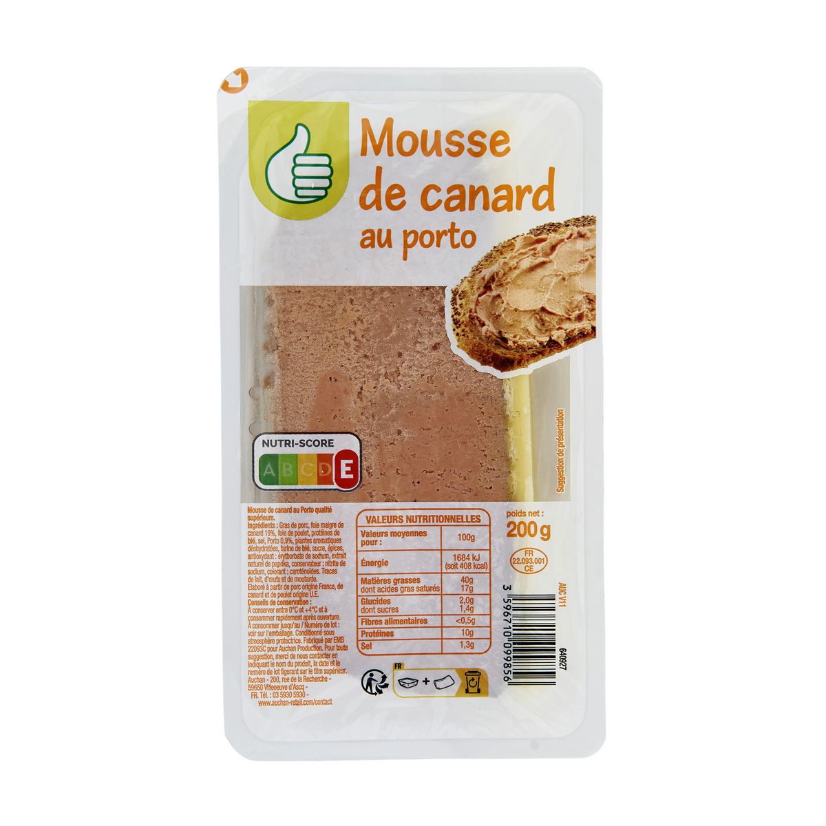 Ingrédients : Gras de porc, foie maigre de canard 19%, foie de poulet, protéines de BLÉ, sel, Porto 0,9%, plantes aromatiques déshydratées, farine de BLÉ, sucre, épices, antioxydant : érythorbate de sodium, extrait naturel de paprika, conservateur : nitrite de sodium, colorant : caroténoïdes. Traces de lait, d'œufs et de moutarde. Elaboré à partir de porc origine France, de canard et de poulet origine U.E.