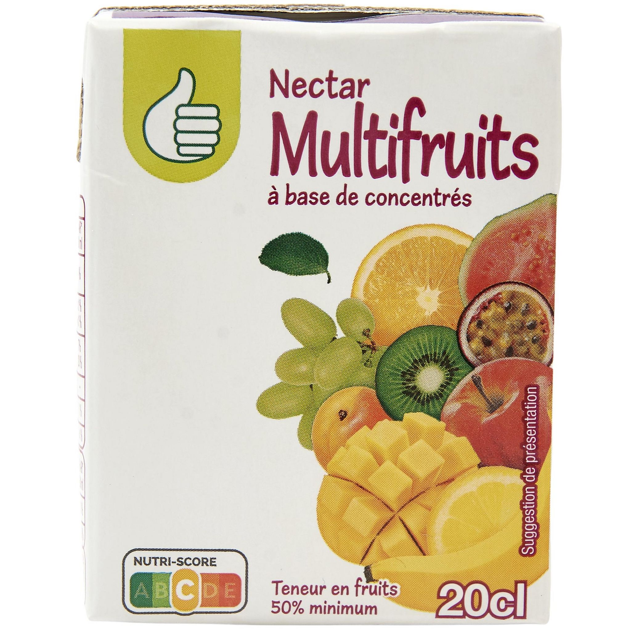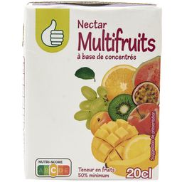 Nectar multifruits à base de jus et purées de fruits concentrés à l'édulcorant naturel. Teneur en fruits: 50% minimum