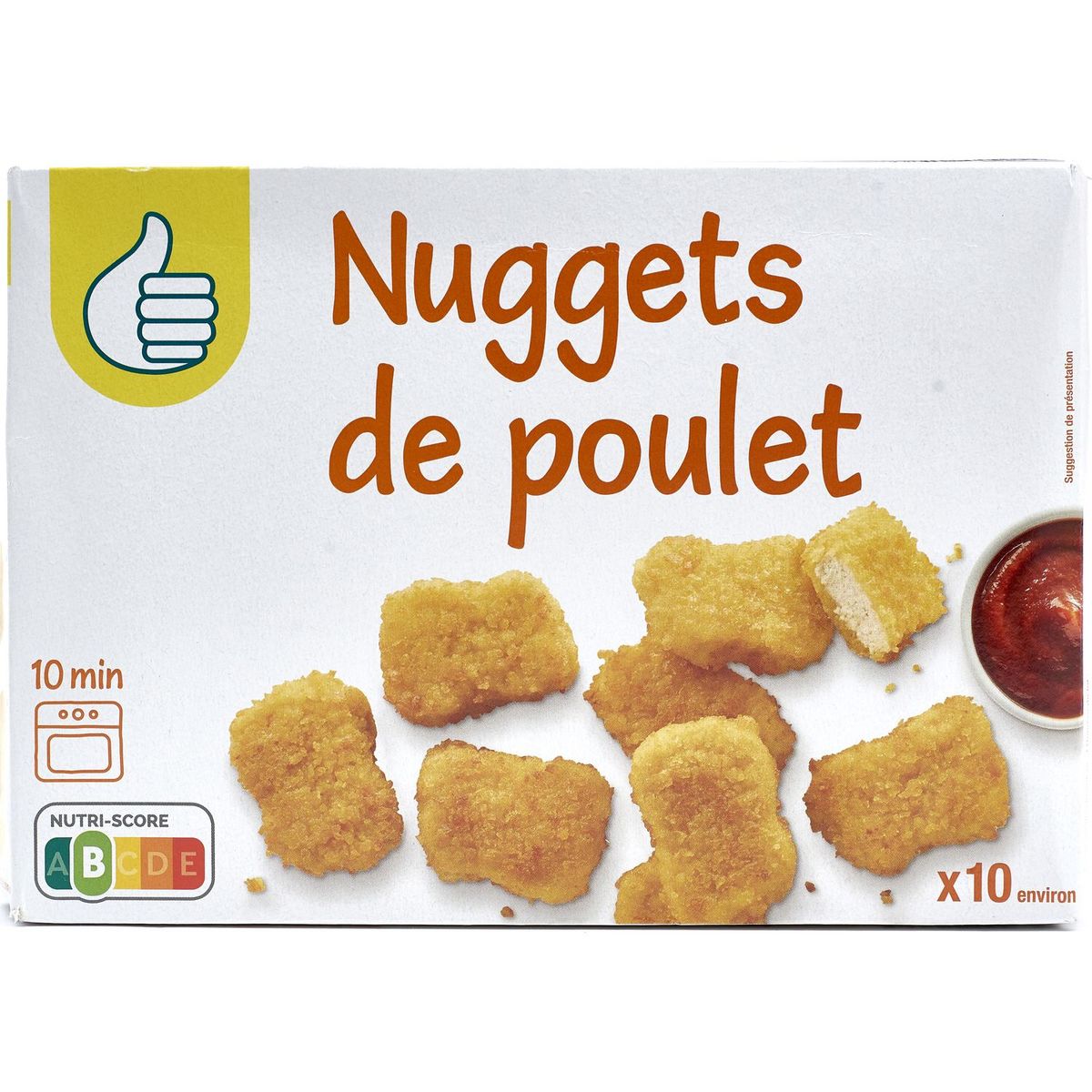 Ingrédients : Viande de poulet traitée en salaison : 68 % (viande de poulet : 49 %, eau, peaux de poulet, fibres de blé (contient gluten), dextrose de blé, sel, arôme naturel, antioxydant : ascorbate de sodium), panure : 32% (eau, farine de blé (contient gluten), sel, levure, épices). Friture à l’huile de tournesol. Traces éventuelles de lait et soja. Pourcentages exprimés sur le total de la recette. Elaboré à partir de poulet origine UE.