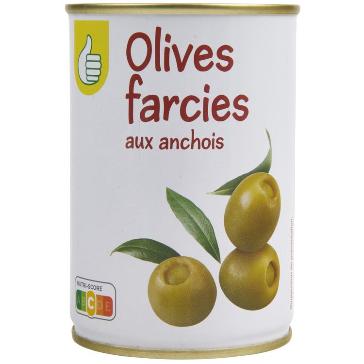Ingrédients : Eau, olives vertes dénoyautées (origine Espagne), pâte d'anchois (poisson) 6% (anchois (poisson) 0.72%, gélifiant : alginate de sodium), sel, acidifiant : acide citrique, antioxydant : acide ascorbique.% exprimés sur le poids net égoutté