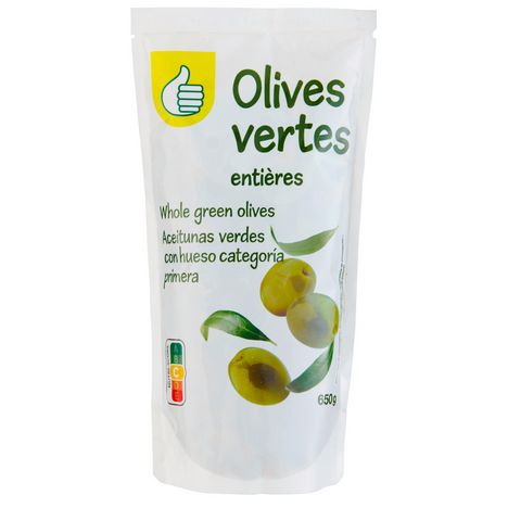 Ingrédients : olives vertes entières 61 % (origine Maroc et/ou Espagne et/ou Egypte), eau, sel, acidifiant : acide lactique, antioxydant : acide ascorbique.