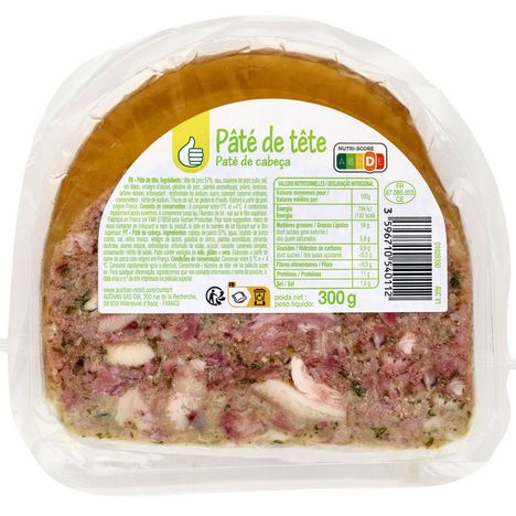 Ingrédients : Tête de porc 57%, eau, couenne de porc cuite, sel, vin blanc, vinaigre d'alcool, gélatine de porc, plantes aromatiques, poivre, dextrose, arôme naturel, antioxydant: érythorbate de sodium, sucre, colorant: caramel ordinaire, conservateur: nitrite de sodium. Traces de lait, de gluten et d'oeufs. Elaboré à partir de porc origine France.