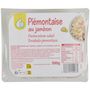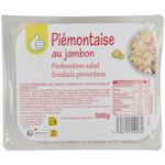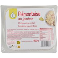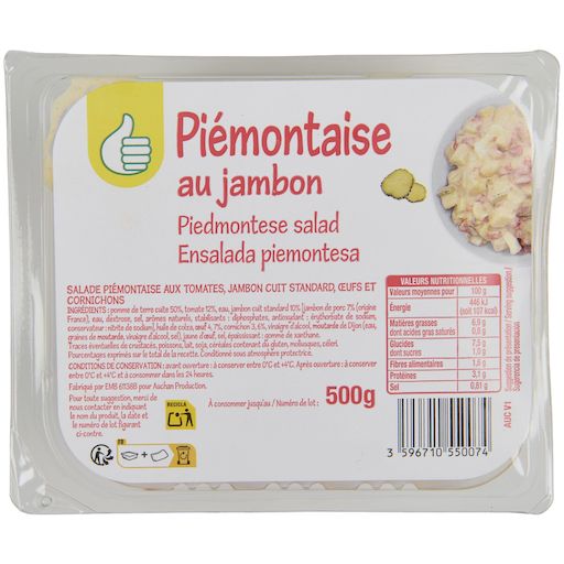 Ingrédients : Pomme de terre cuite 50%, tomate 12%, eau, jambon cuit standard 10% [jambon de porc 7% (origine France), eau, dextrose, sel, arômes naturels, stabilisants : diphosphates, antioxydant : érythorbate de sodium, conservateur : nitrite de sodium], huile de colza, OEUF 4,7%, cornichon 3,6%, vinaigre d'alcool, MOUTARDE de Dijon (eau, graines de MOUTARDE, vinaigre d'alcool, sel), jaune d'OEUF, sel, épaississant : gomme de xanthane. Traces éventuelles de crustacés, poissons, lait, soja, céréales contenant du gluten, mollusques, céleri. Pourcentages exprimés sur le total de la recette.