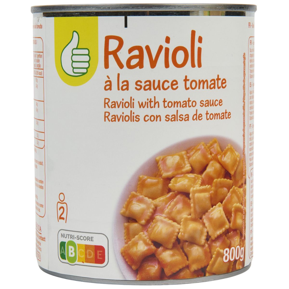 Ingrédients : Eau, ravioli (semoule de BLÉ dur, eau, viande de poulet (4% du poids net total), chapelure (contient BLÉ), carottes, sel, huile decolza, oignons, arôme naturel, épices, plantes aromatiques), purée de tomate mi-réduite 10%, carottes, oignons, amidon modifié, sel, sucre, huile de colza, arômenaturel (contient CÉLERI). Traceséventuelles d'œufs et de lait Elaboré à partir de poulet origine UE