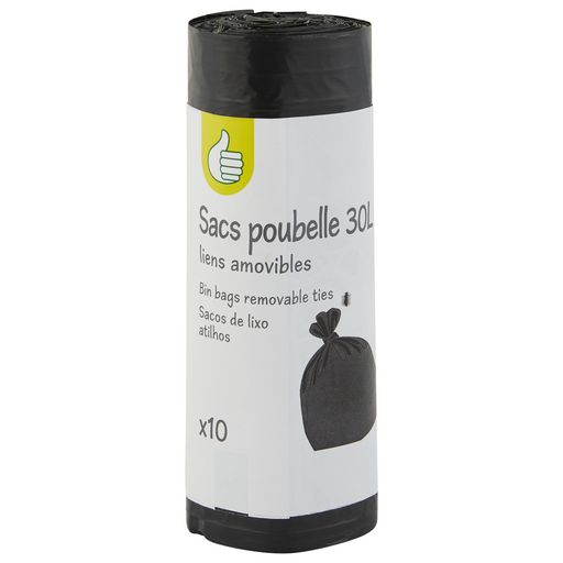 10 sacs poubelles 30 litres à liens amovibles. Fabriqués en France.