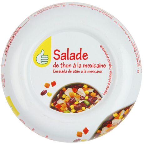 Ingrédients : Eau, haricots rouges réhydratés 20% (haricots rouges, eau), thon listao (poisson) 20%, maïs 10%, carottes 9%, poivrons 7%, oignons 3,9%, huile de colza, vinaigre d'alcool, haricots verts 1,4%, sel, double concentré de tomates, amidon de riz, paprika, épaississant : gomme guar cumin, piment fort.