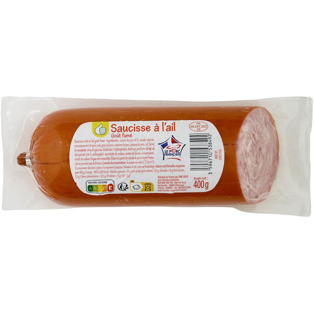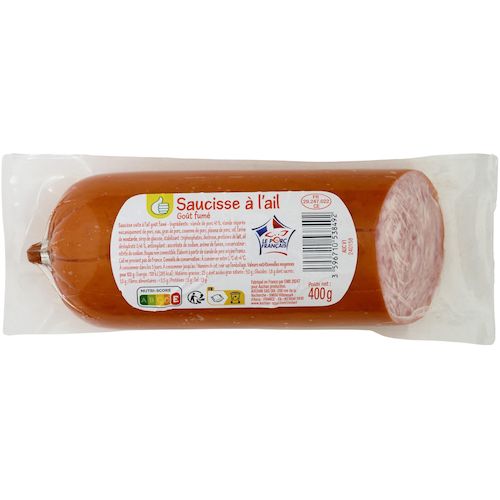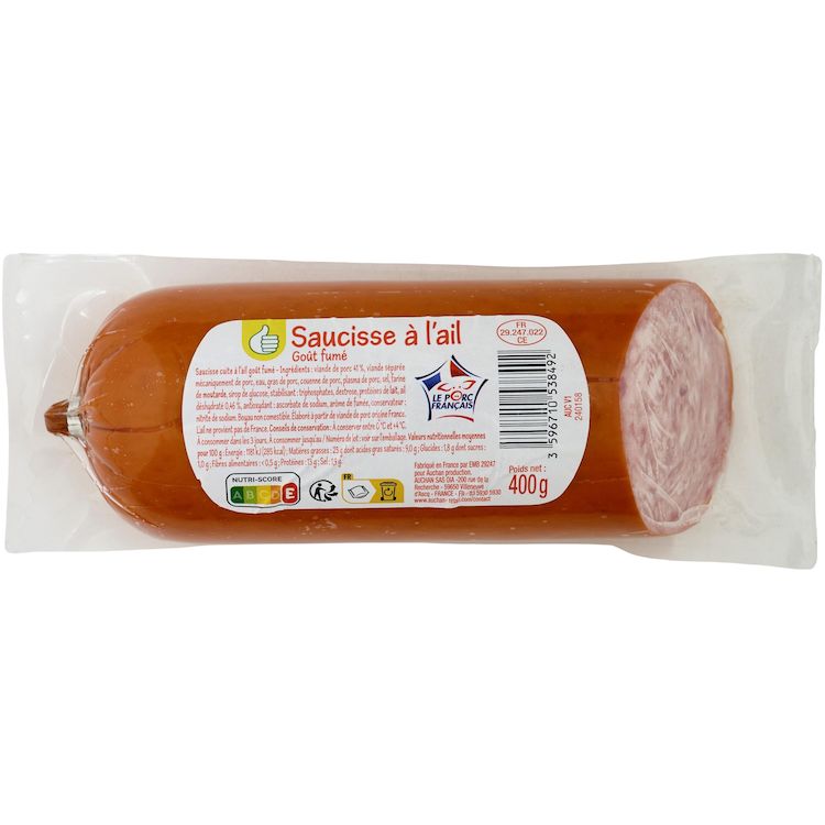 Ingrédients : viande de porc 41%, viande séparée mécaniquement de porc, eau, gras de porc, couenne de porc, plasma de porc, sel, farine de MOUTARDE, sirop de glucose, stabilisant : triphosphates, dextrose, protéines de LAIT, ail déshydraté 0.46%, antioxydant : ascorbate de sodium, arôme de fumée, conservateur : nitrite de sodium. Boyau non comestible. Elaboré à partir de viande de porc origine France. L'ail ne provient pas de France.