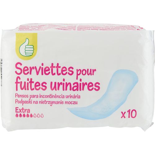 Voile de surface (non-tissé polypropylène). Couche d'acquisition (polyester). Corps absorbant (fibres de cellulose, superabsorbant (polyacrylate de sodium)). Enveloppe extérieure (film polyéthylène). Elastiques (élasthanne). Colles.