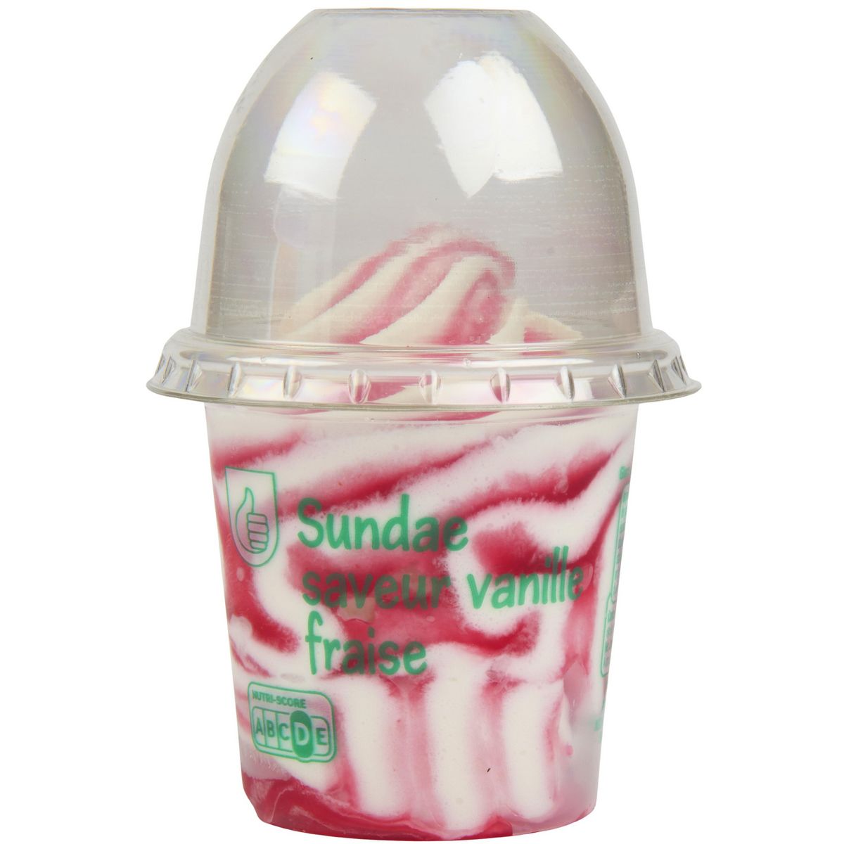Un dessert vendu à l'unité à base de crème glacée onctueuse à la vanille accompagnée d’une délicieuse sauce aux fraises