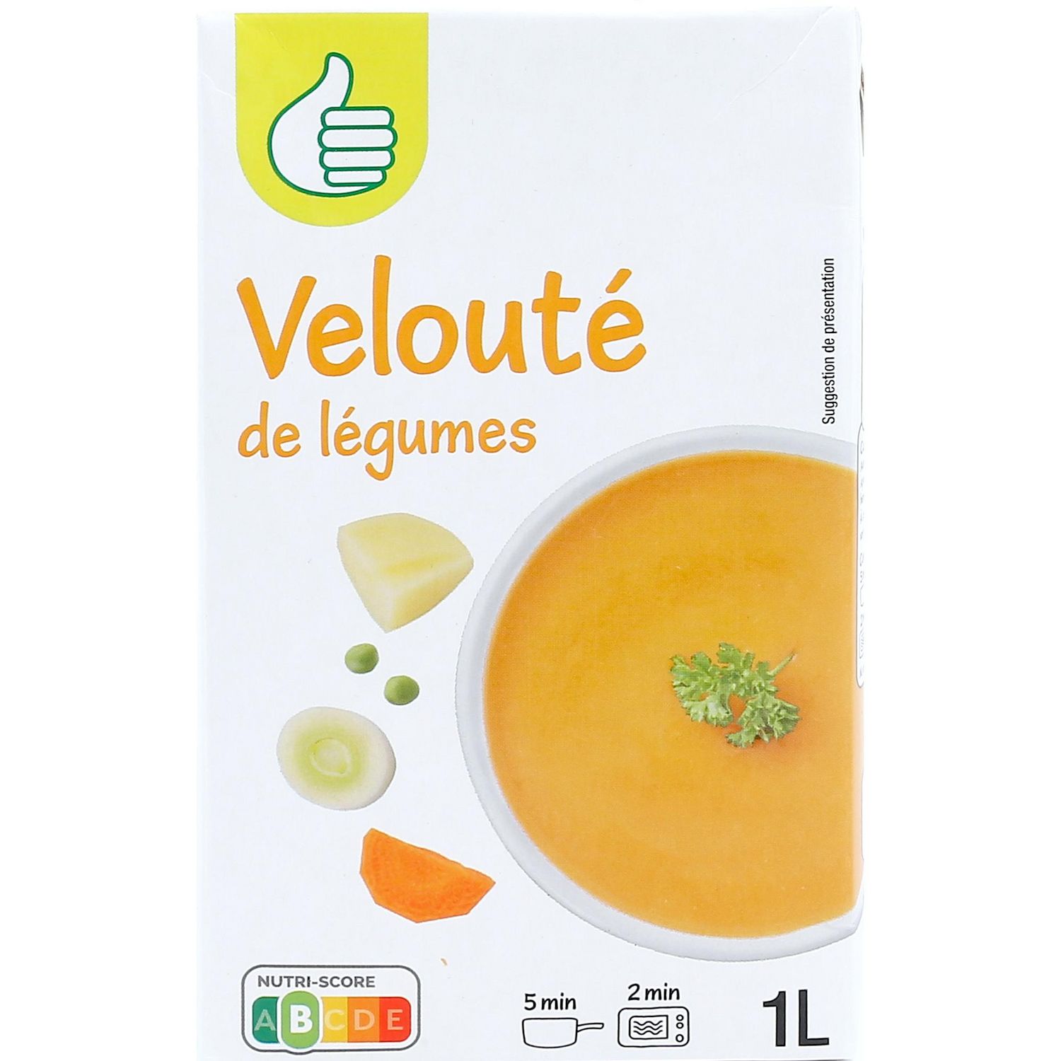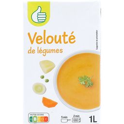 Ingrédients : Eau, jus de tomates à base de concentré 19%, carottes 14%, pommes de terre 8%, oignons 3%, potiron 2%, poireaux 2%, amidon transformé de maïs, lait écrémé reconstitué (lait), petit pois 1%, céleri 1%, beurre (lait), sel. Élaboré à partir de légumes et de lait origine UE Teneur en légumes : 50% Traces éventuelles de crustacés, poisson, mollusques, moutarde, céréales contenant du gluten, œufs, soja et fruits à coque.