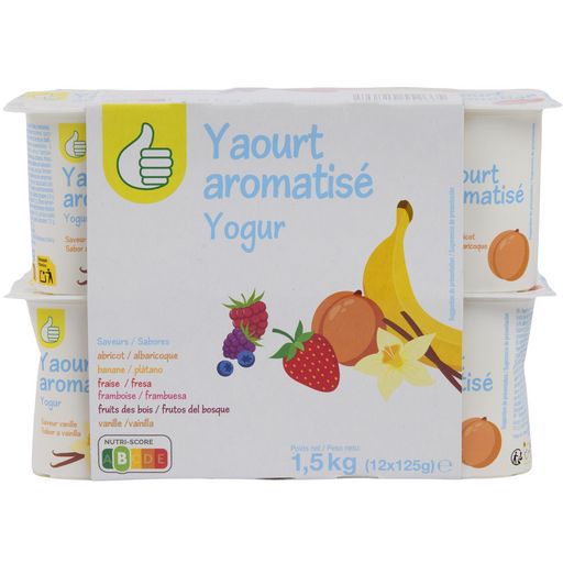 Yaourt sucré aromatisé : saveurs abricot, banane, fraise, framboise, fruits des bois, vanille