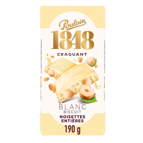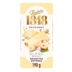 1848 Tablette de chocolat blanc aux noisettes entières et aux céréales soufflées