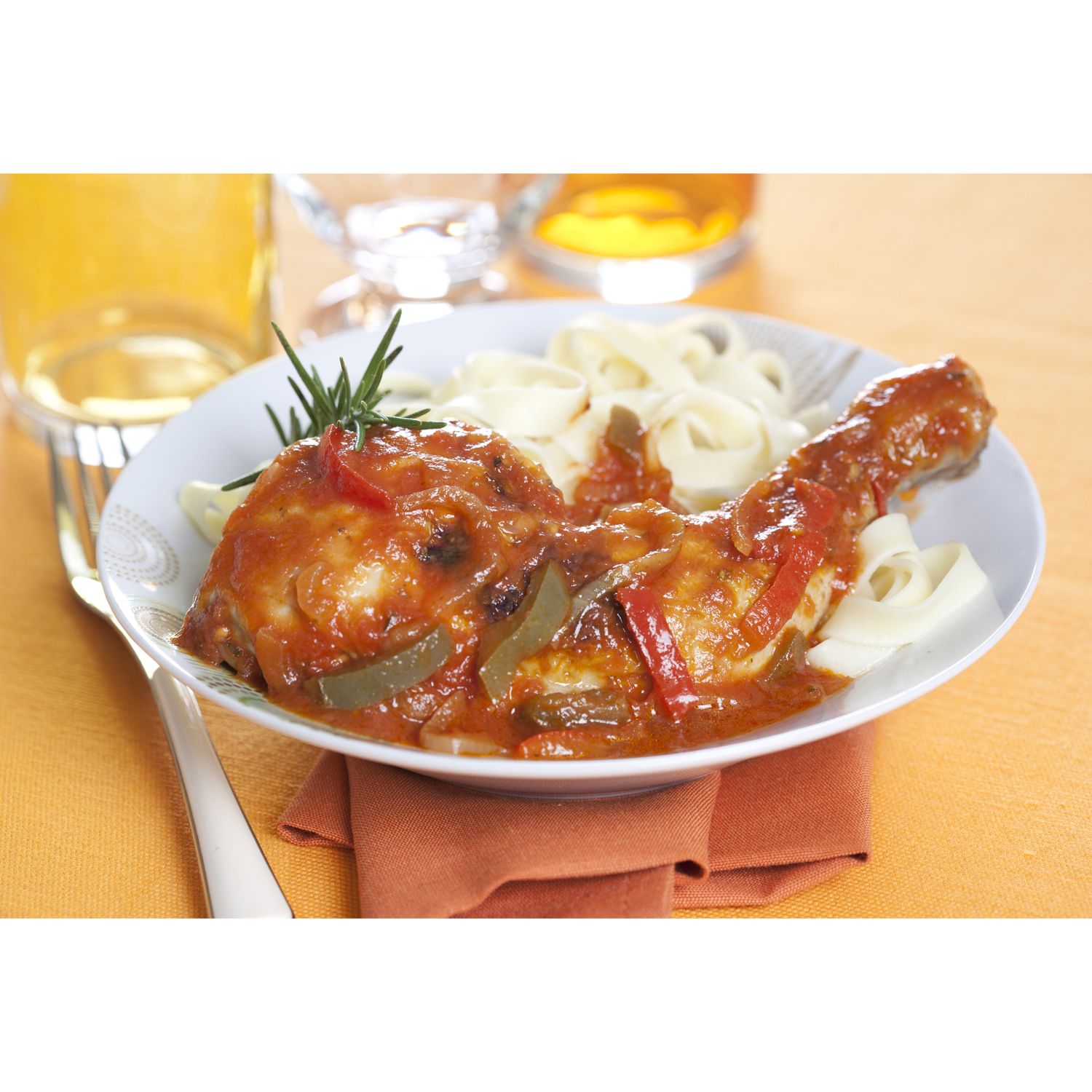 Ingrédients : Haut de cuisse de poulet 30,0% (Origine France), eau, tomate pelée concassée au jus 11,0% [tomate, jus de tomate,