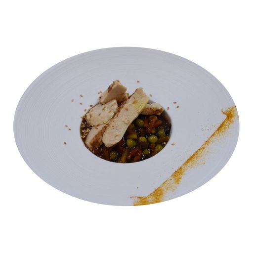Emincé de filet de poulet parfumé et cuit 21,7% [filet de poulet 19,9% (Origine : UE ou Hors UE), sel, fécule de pomme de terre, épices (cannelle, coriandre, piment, noix de muscade, clou de girofle, anis), dextrose, stabilisant : triphosphates, gélifiant : carraghénanes], julienne de carotte 15,0%, petit pois 12,4%, julienne de carotte jaune 10,5%, eau, poivron rouge en cube 9,2%, sauce SOJA (eau, graine de SOJA, sel, farine de BLE), champignon noir en lanière 6,2% (Auricularia polytricha), ail en purée (ail, sel, acidifiant : acide citrique), sucre, huile de SESAME, amidon modifié de maïs, gélatine de bœuf, mélange d'épices (piment, peau d'orange, graine de SESAME noire, algue, graine de SESAME blanche, poivre japonais, gingembre). Traces éventuelles de lait, œufs, céleri, poisson, crustacés, mollusques, moutarde et fruits à coque.