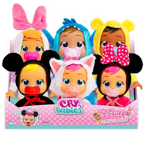 Poupon Cry Babies de 25 cm, au corps souple habillé en personnage Disney. Il qui pleure de vraies larmes lorsqu'on presse sa tête. Existe en 5 modèles différents : Minnie, Mickey, Stitch, Marie, Winnie, Daisy. Inclus 1 tétine.