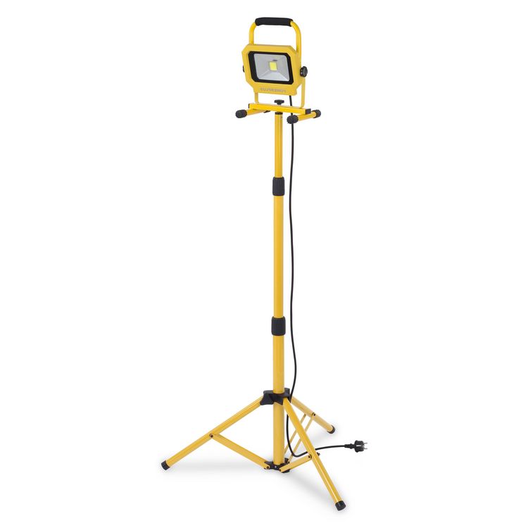 Projecteur portatif équipé d&rsquo,un cadre en acier avec patins antidérapants, poignée gainée et bouton à vis pour l&rsquo,orientation verticale. Livré avec un trépied pliable et réglable en hauteur jusqu',à 150 cm. Corps en aluminium. Eclairage par LED 20W. Ne dégage pas de chaleur. Protection IP65 pour une utilisation en extérieur. Câble d',alimentation 2,5 m.