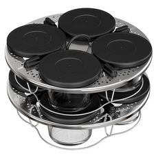 FonctionsComposé de 8 pots en verre individuels et d'un support breveté permettant de cuire sur deux niveaux, ce kit rend la préparation des repas plus pratique et plus facile que jamais, tout comme le nettoyage