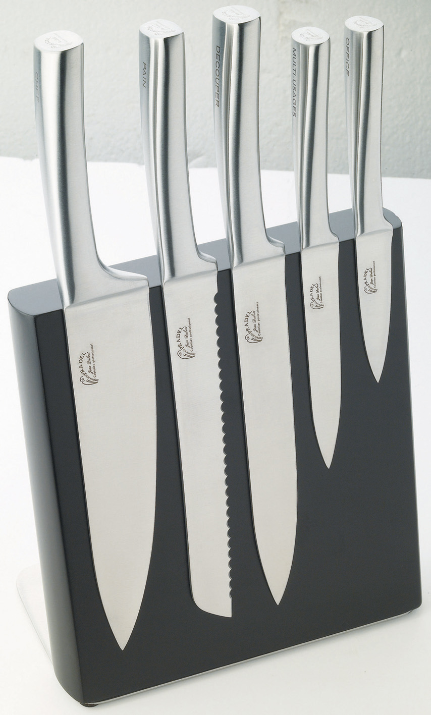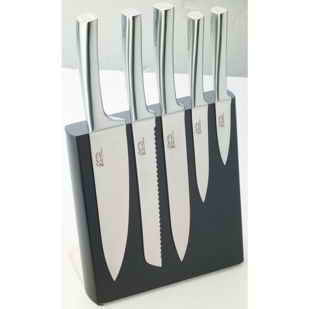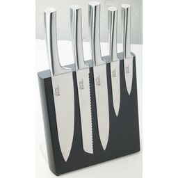 Bloc noir avec façade aimantée comprenant 5 couteaux de cuisine METEOR tout inox. Comprend: 1 Couteau de chef, 1 couteau à pain, 1 couteau à découper , 1couteau multi-usages et 1 couteau d'office. Les couteaux Pradel sont reconnus pour leur robustesse et leur tranchant efficace.