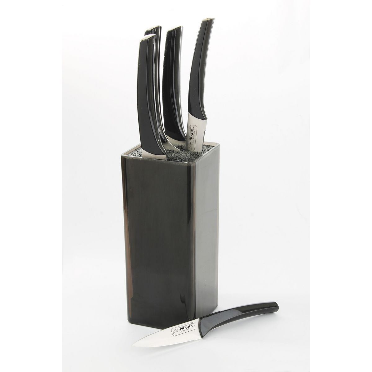 Bloc universel en ABS noir comprenant 5 couteaux de cuisine SPIRIT. Composés en acier inox pleine soie, manche ABS noir. Contient 1 office, 1 universel, 1 pain, 1 chef, 1 découpeur. Les couteaux Pradel sont reconnus pour leur robustesse et leur tranchant efficace.
