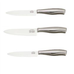 En savoir +Soyez certain de toujours avoir le bon couteau sous la main grâce à ce lot de 3 couteaux céramique avec manche tout inox. Couteau office 10 cm, couteau multi-usage 13 cm, couteau chef 15 cm. Lame céramique au tranchant incomparable. Manche en inox, résistant et tenant parfaitement dans la main. Livrés avec étuis de protection de lame pour un rangement sûr. Ces 3 couteaux cuisine s'entretiennent facilement.