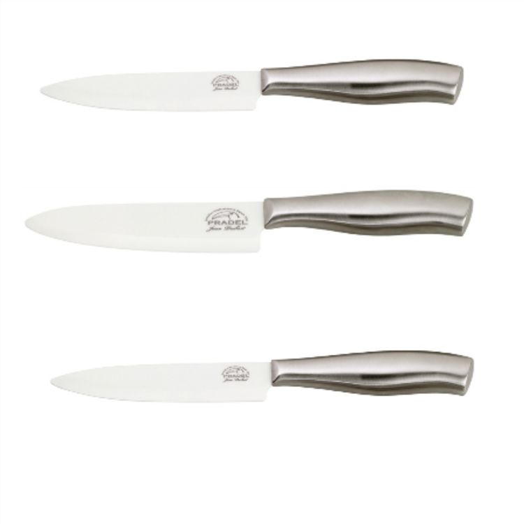 Soyez certain de toujours avoir le bon couteau sous la main grâce à ce lot de 3 couteaux céramique avec manche tout inox. Couteau office 10 cm, couteau multi-usage 13 cm, couteau chef 15 cm. Lame céramique au tranchant incomparable. Manche en inox, résistant et tenant parfaitement dans la main.
