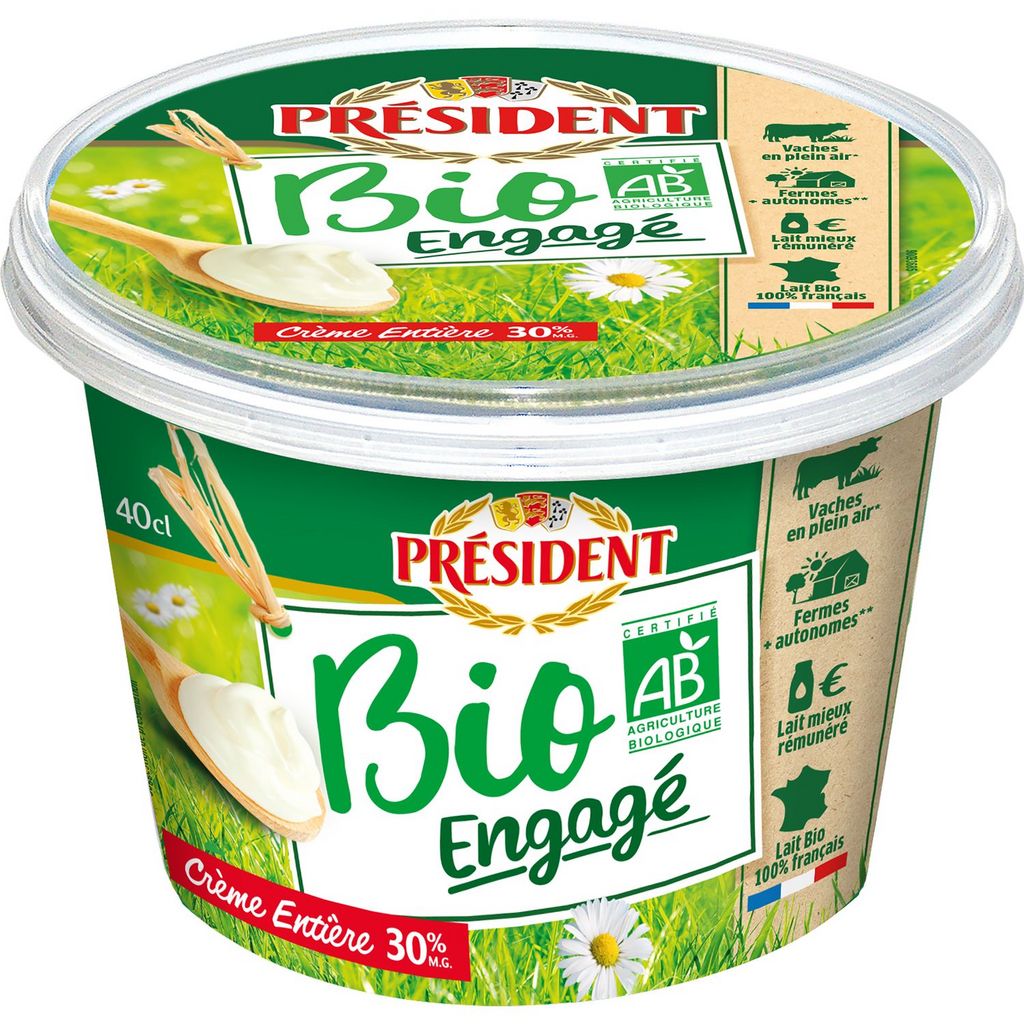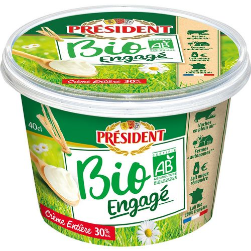 Elaborée en Normandie.Pour élaborer cette crème,PRESIDENT a sélectionné pour vous un lait issu de l'agriculture biologique sans conservateur,sans colorant* ni arôme artificiel*.Si notre crème est si bonne et onctueuse,c'est avant tout parce que les vaches des fermes bio PRESIDENT sont élevées en plein air et nourries avec de l'herbe et des fourrages*. *conformément à la réglementation en vigueur sur le mode de production biologique Crème fraîche épaisse biologique à 30% MG