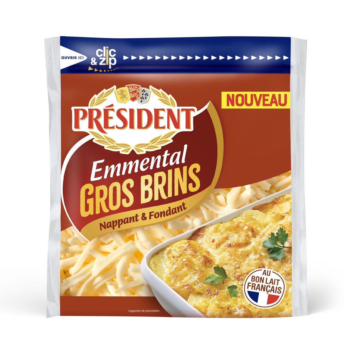 Un Emmental spécialement conçu pour être plus nappant et plus fondant, râpé en gros brins parfaits pour les plats au four.
