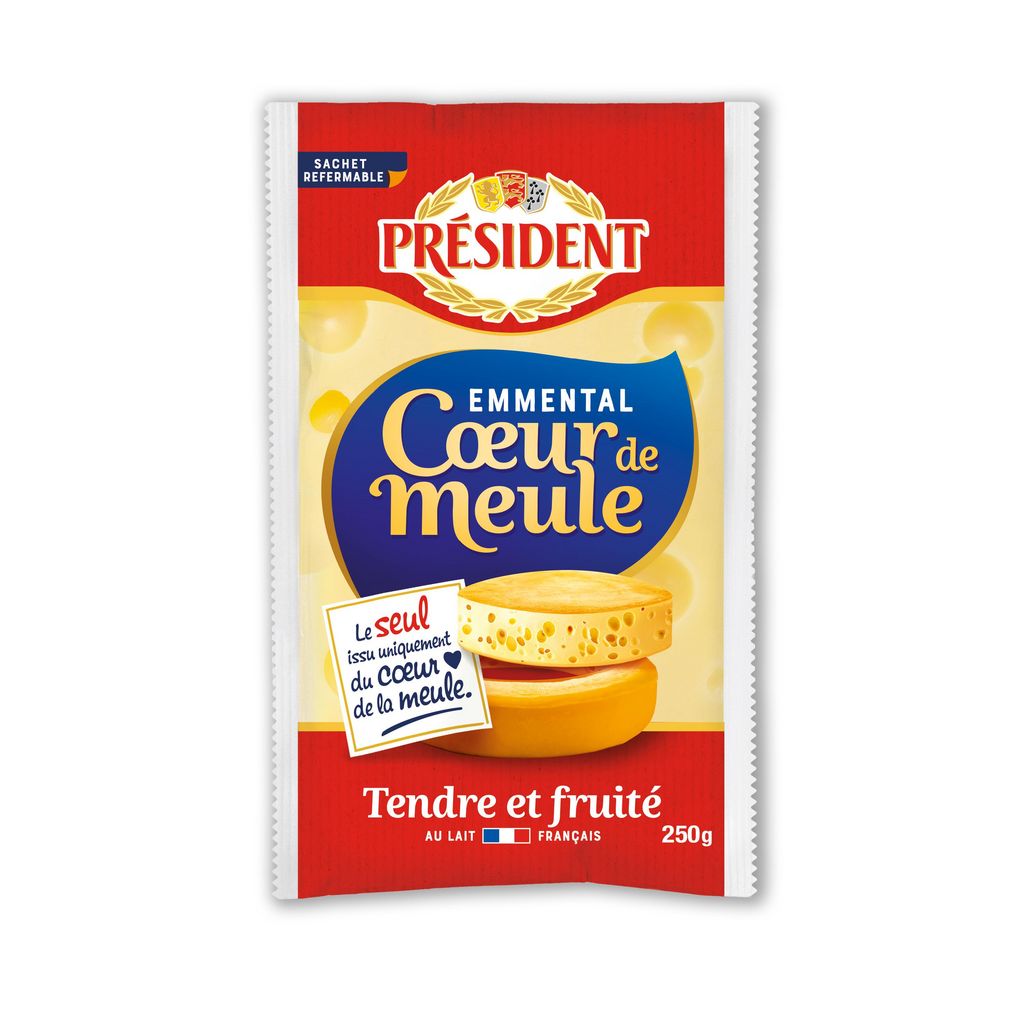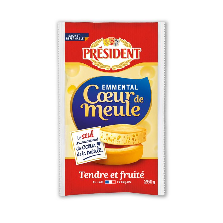 Président sélectionne son emmental exclusivement au coeur de la meule. Et oui, c’est au coeur de la meule que sa texture est la plus tendre et son goût le plus fruité. Ainsi avec l’Emmental Président Coeur de Meule toute la famille se régale, aussi bien les petits que les grands.