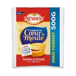 Président sélectionne son emmental exclusivement au coeur de la meule. Et oui, c’est au coeur de la meule que sa texture est la plus tendre et son goût le plus fruité. Ainsi avec l’Emmental Président Coeur de Meule toute la famille se régale, aussi bien les petits que les grands.
