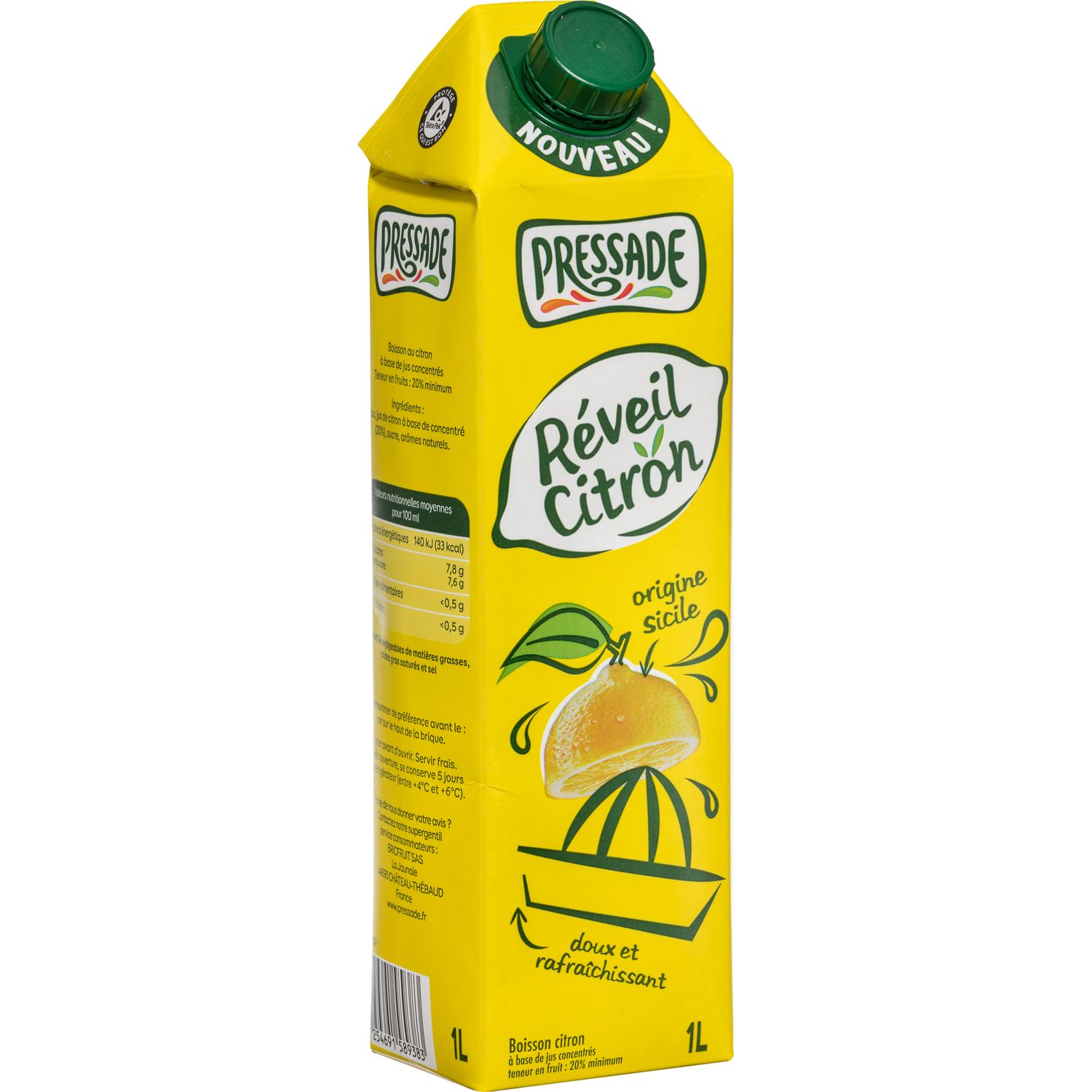 "Parce qu’avec ses boissons « Réveil Citron », Pressade vous propose dans une boisson rafraîchissante et délicieuse toute la gentillesse de la Nature ! Pressade a sélectionné de gentils citrons venus de Sicile et concocté une savoureuse boisson au goût tout doux et légèrement acidulé...juste comme il faut" Boisson citron à base de jus concentré.