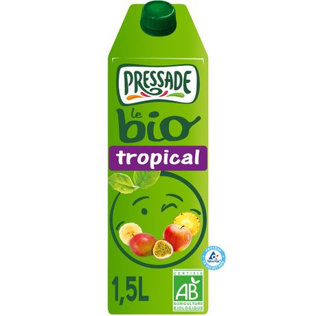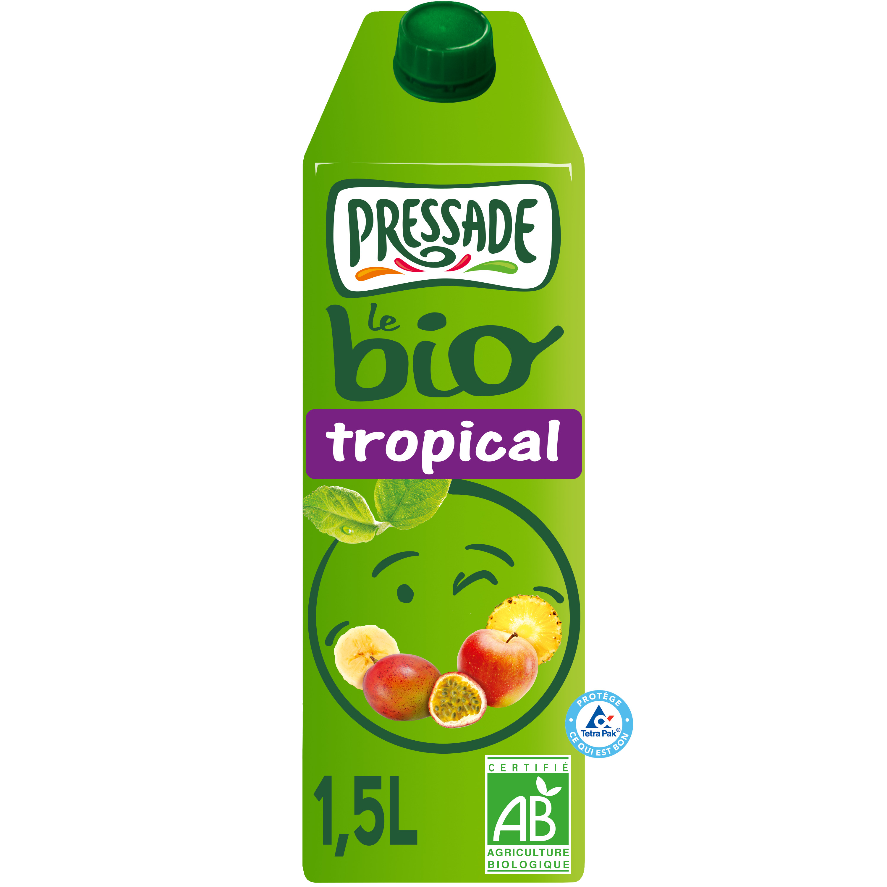 Pressade Nectar Bio Tropical est un délicieux nectar à base de jus de fruits concentrés bio : une recette douce et gourmande avec un bon goût de fruits pour le plaisir des enfants et des plus grands. Le tout dans une brique composée à 86% de matière d'origine végétale. Pressade Nectar Bio Tropical est certifiée "Agriculture Biologique" par ECOCERT. En format familial 1.5L, Pressade vous accompagne à tout moment de la journée, du petit-déjeuner au goûter.