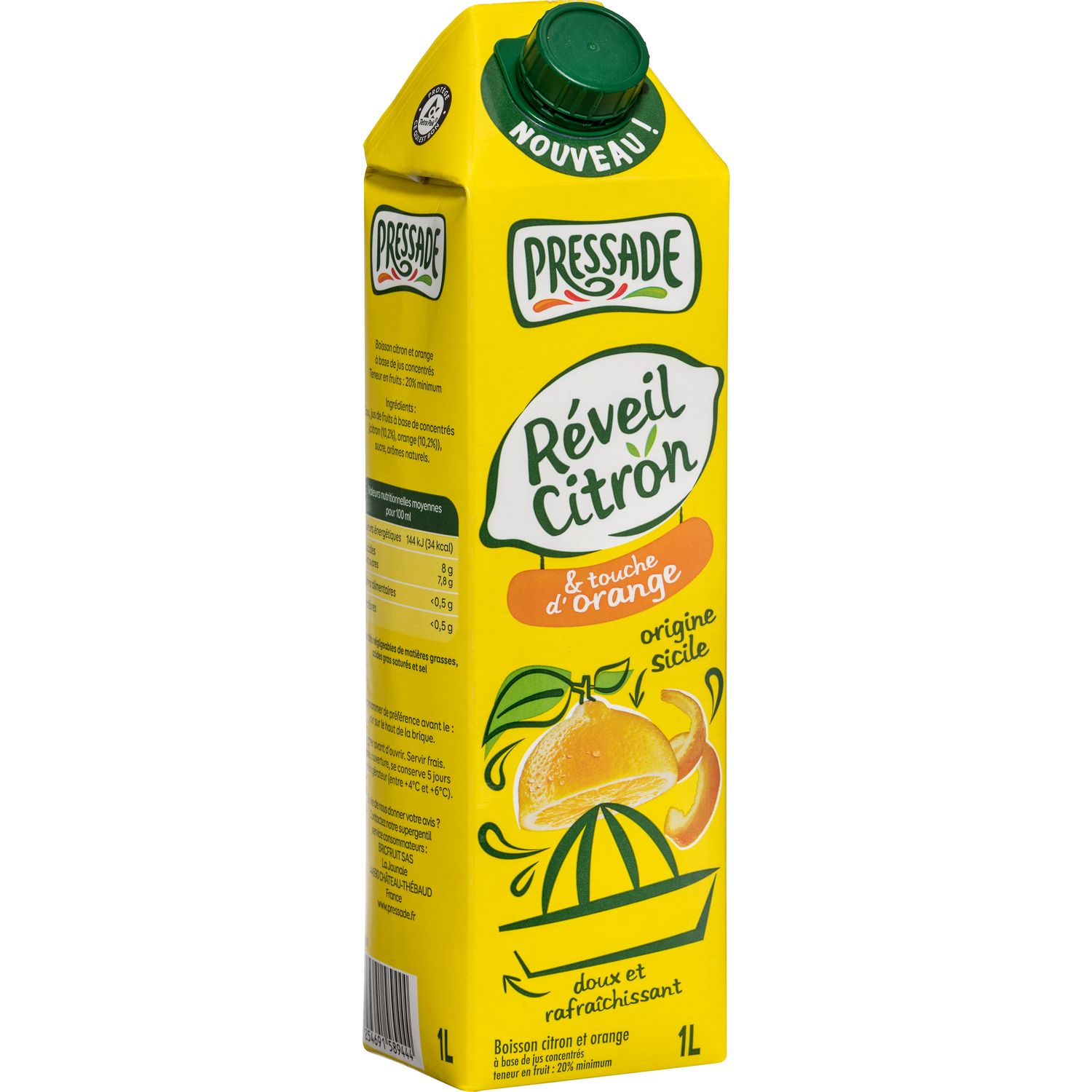 Boisson citron et orange à base de jus concentrés. "Parce qu’avec ses boissons « Réveil Citron », Pressade vous propose dans une boisson rafraîchissante et délicieuse toute la gentillesse de la Nature ! Pressade a sélectionné de gentils citrons venus de Sicile et concocté une savoureuse boisson au goût tout doux et légèrement acidulé...juste comme il faut"