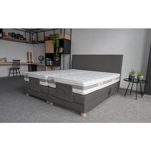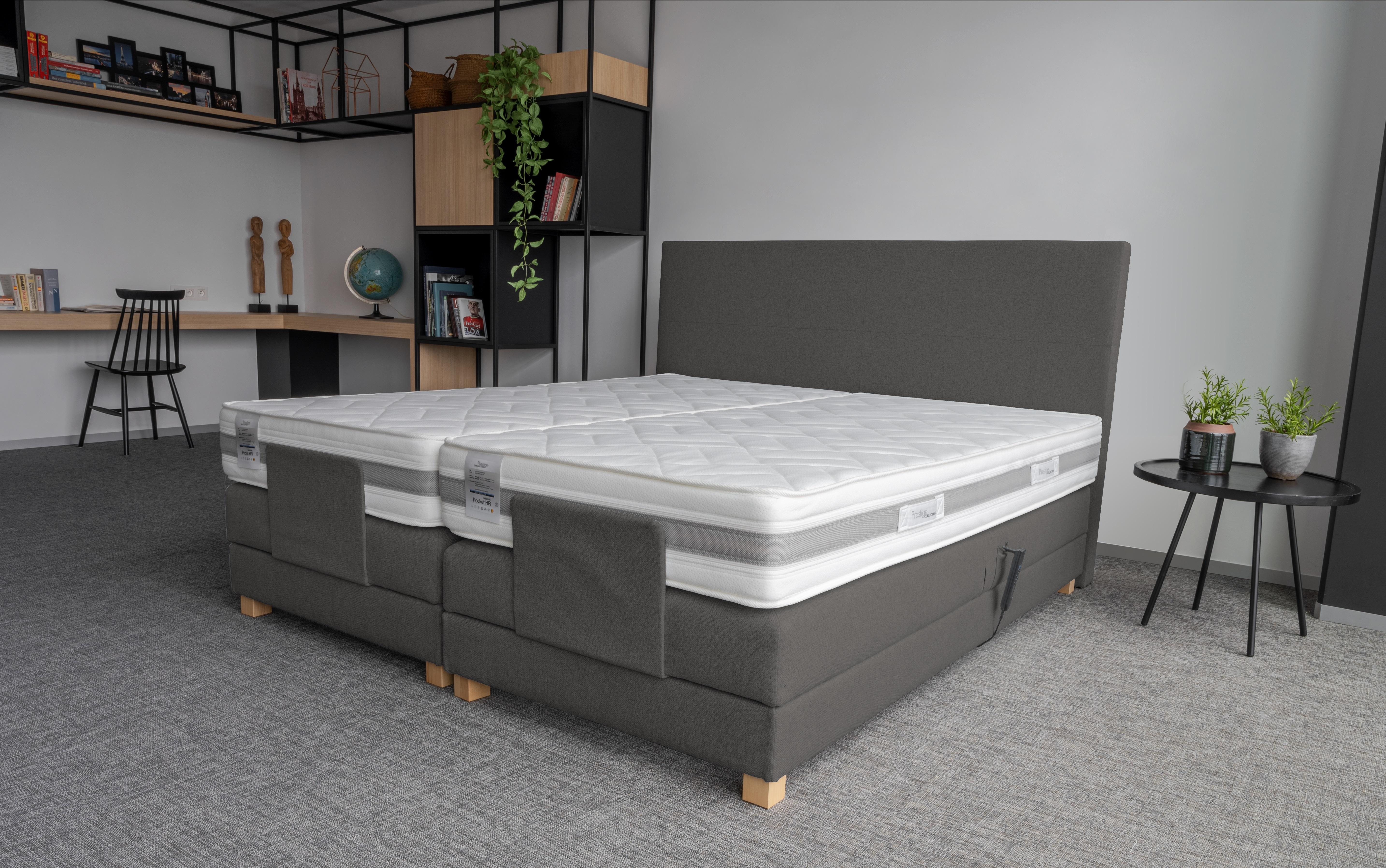 Fabrication belge. Matière OKOETEX. Confort Hôtellerie. Matelas ressort ensachés 7 zones, ceinture périmetrale renforcée, bande 3D aération, plateaux et plates bandes piqués matelassés, poignées siglées, mousse HD. Sommier électrique et tête de lit Déco, structure ressort bonnel hottelerie 120 ressort/m2, encadrement bois massif garnissage ouate, tissu d'ameublement gris.
