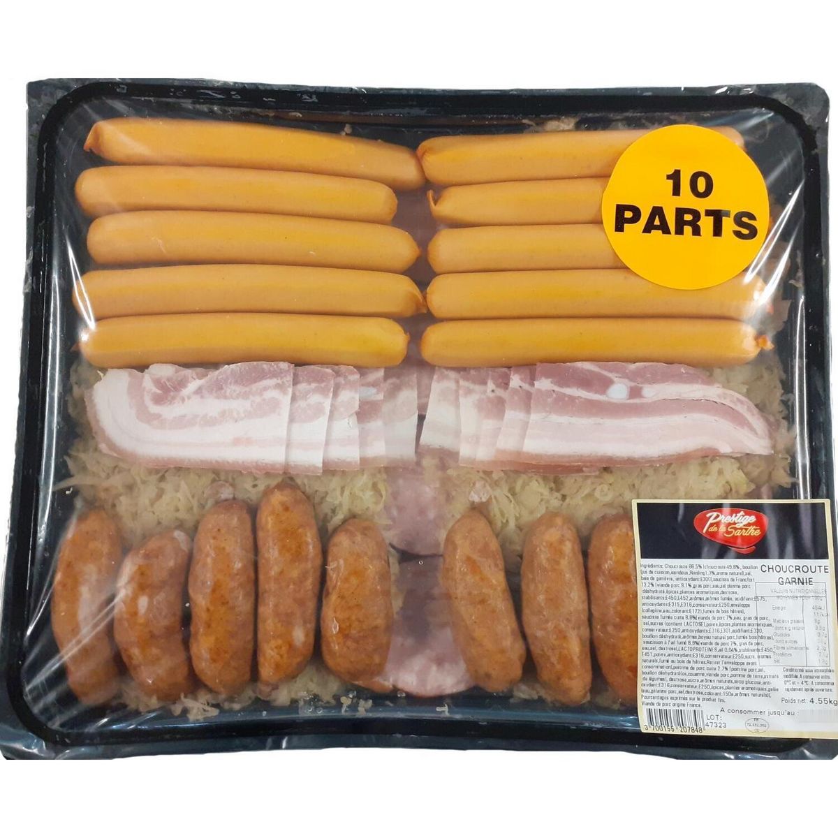 Ingrédients : Choucroute cuisinée au Riesling 66,5% [choucroute (chou, sel) 49,8%, bouillon ( jus de cuisson, saindoux, Riesling 1.3 %, arôme naturel), sel, baies de genièvre, antioxydant: E300] , saucisse de Francfort supérieure 13,2% [viande de porc 10%, gras de porc, eau, sel, plasma de porc, épices et plantes aromatiques, arômes naturels, dextrose, jus concentré d'acérola déshydraté, conservateur : E250, boyau naturel de mouton, fumée au bois de hêtres], saucisse fumée cuite supérieure 8,8% [Viande de porc 7%, gras de porc, eau, sel, sucres (contient LACTOSE), poivre, épices et plantes aromatiques, conservateur : E250, antioxydants : E316 et E301, acidifiant : E330, bouillon déshydraté (os, couenne et viande de porc, pomme de terre, extrait de légumes), arômes, boyau naturel de porc, fumée au bois de hêtres], saucisson à l'ail à l'ancienne fumé 8,8% [Viande de porc 8,4%, eau, blancs d’OEUF liquide, sel, LACTOSE, ail 0,01 %, poivres, muscade, antioxydant : E300, piment de Jamaïque, conservateur : E250, fumé au bois de hêtres. Retirer l'enveloppe avant consommation], poitrine de porc cuite de qualité supérieure 2,7% [poitrine de porc, sel, bouillon déshydraté (os, couenne et viande de porc, pomme de terre et extraits de légumes), dextrose , sucre, arômes naturels, sirop de glucose, antioxydant : E316, conservateur: E250, épices et plantes aromatiques, gelée (eau, gélatine (issue de couenne de porc), sel, dextrose, colorant: E150a, arômes naturels)] . Pourcentages exprimés sur le produit fini.Conditionné sous atmosphère protectrice.