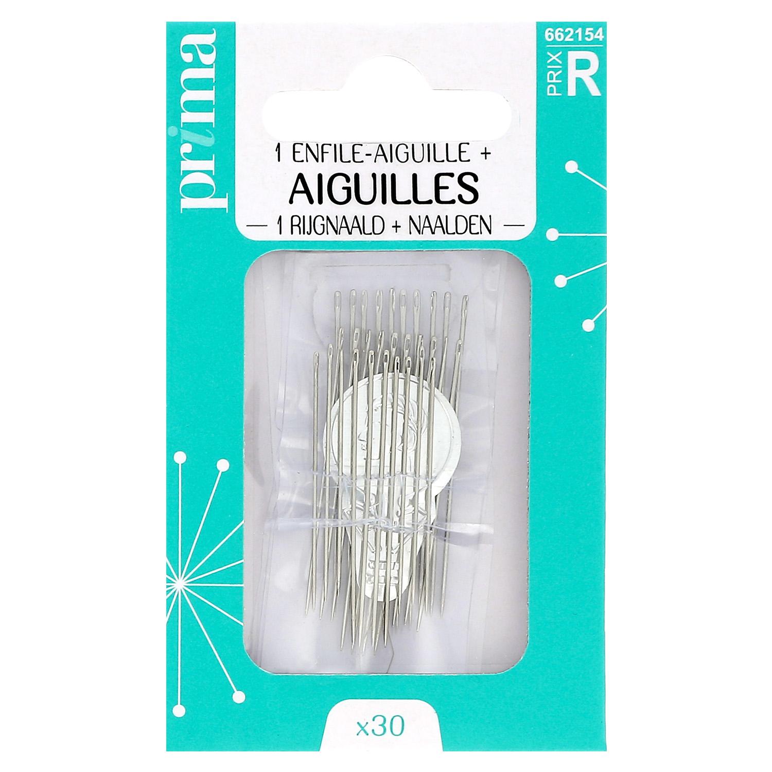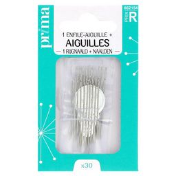 30 aiguilles + 1 enfile-aiguille. Tailles n°3, 5, 7 et 10. Assortiment d'aiguilles et un enfile-aiguilles. Choisissez votre aiguille en fonction de l'épaisseur de votre tissu : plus un tissu est fin, plus le chas de l'aiguille devra être fin pour ne pas marquer le tissu.