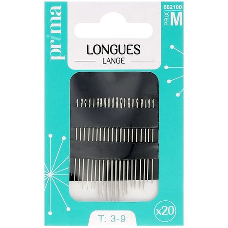 20 aiguilles longues. Tailles n°3, 5, 7 et 9. Tissus fin à moyens. Choisissez l'aiguille selon l'épaisseur du tissu : plus le tissu est fin, plus l'aiguille doit être fine afin de ne pas abîmer les fibres du tissu.