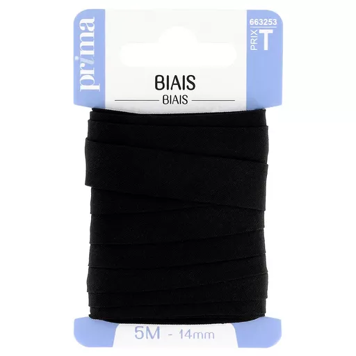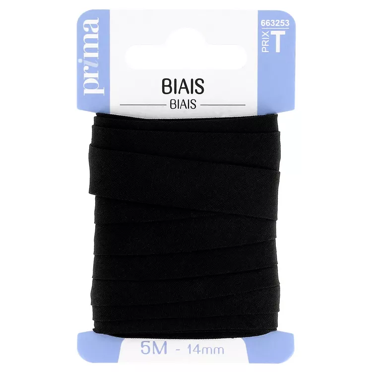 Biais noir. Taille 5 m. Ruban idéal pour border un tissu droit ou arrondi (nappes, emmanchures, encolures…). Il permet aussi de cacher un tissu qui s'effiloche pour une finition impeccable. Posez le biais à cheval sur le bord du tissu, piquez le tissu et le biais pour les maintenir à l'aide d'épingles puis coudre. 30% Coton. 70 Polyester.