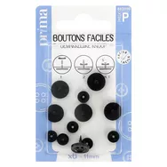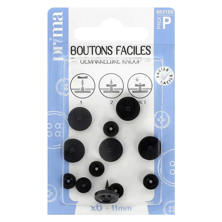 6 boutons faciles blanc. Taille 11 mm. Sans fil ni aiguille, ces boutons se posent en quelques secondes. Entièrement en polyamide, ils résistent à toutes les opérations d'entretien, de brossage et de repassage. Ils sont entièrement recyclable.