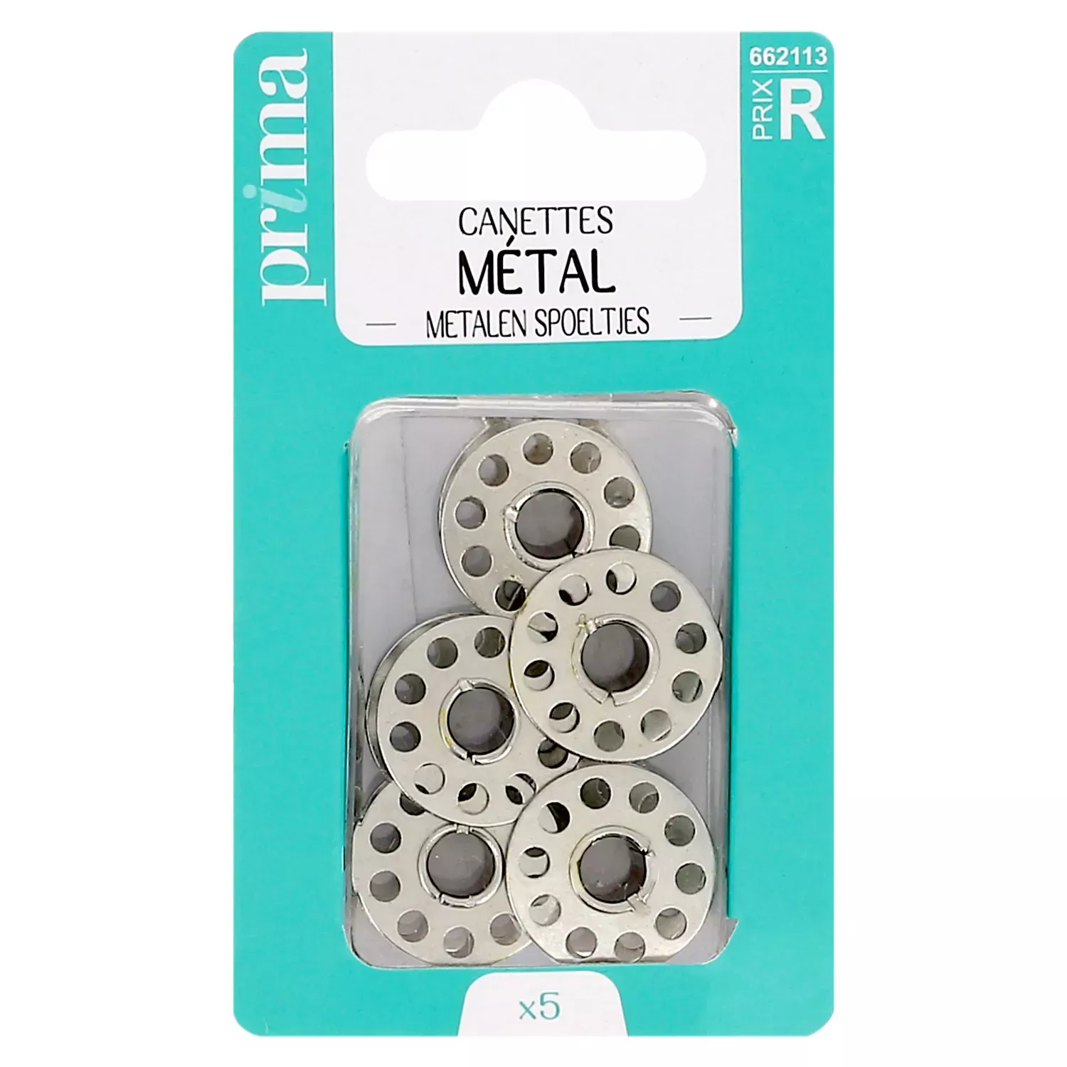 5 canettes en métal. Ce modèle standard convient à la majorité des machines à coudre.