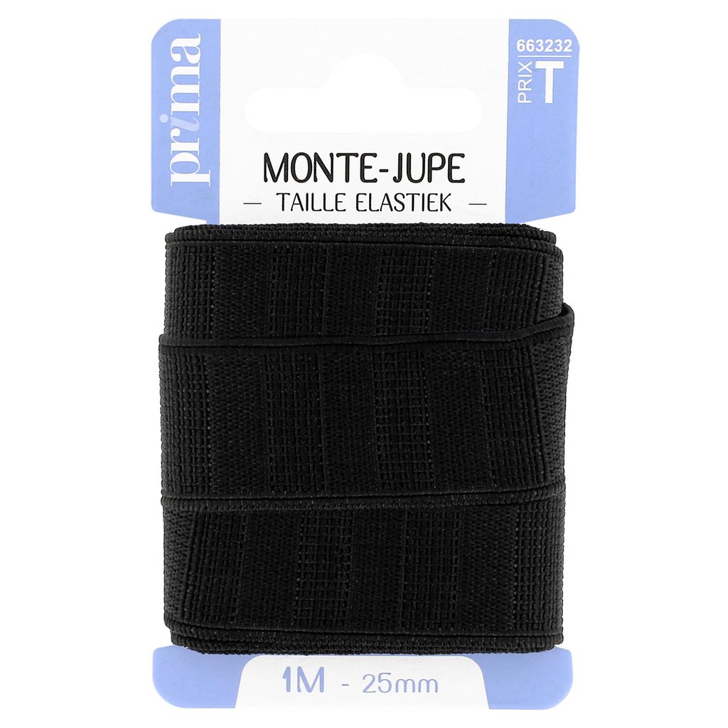 Elastique monte-jupe noir. Taille 1 m. Elastique résistant, recommandé pour les ceintures de jupes et de pantalons. Existe en coloris noir et blanc. Contient du latex. Déconseillé aux personnes allergiques.